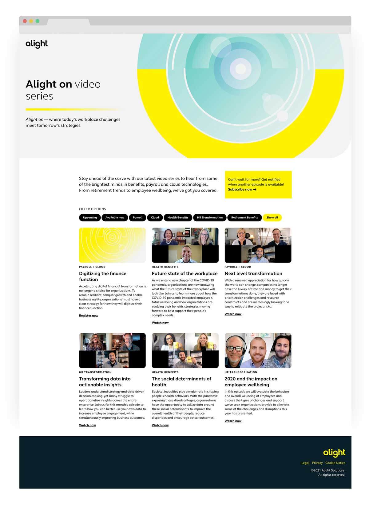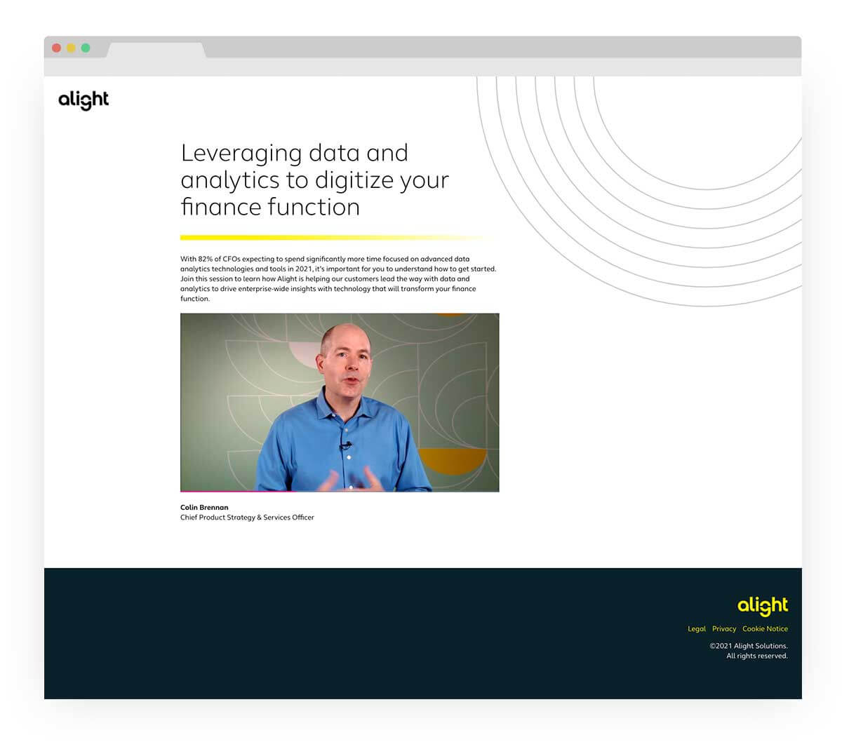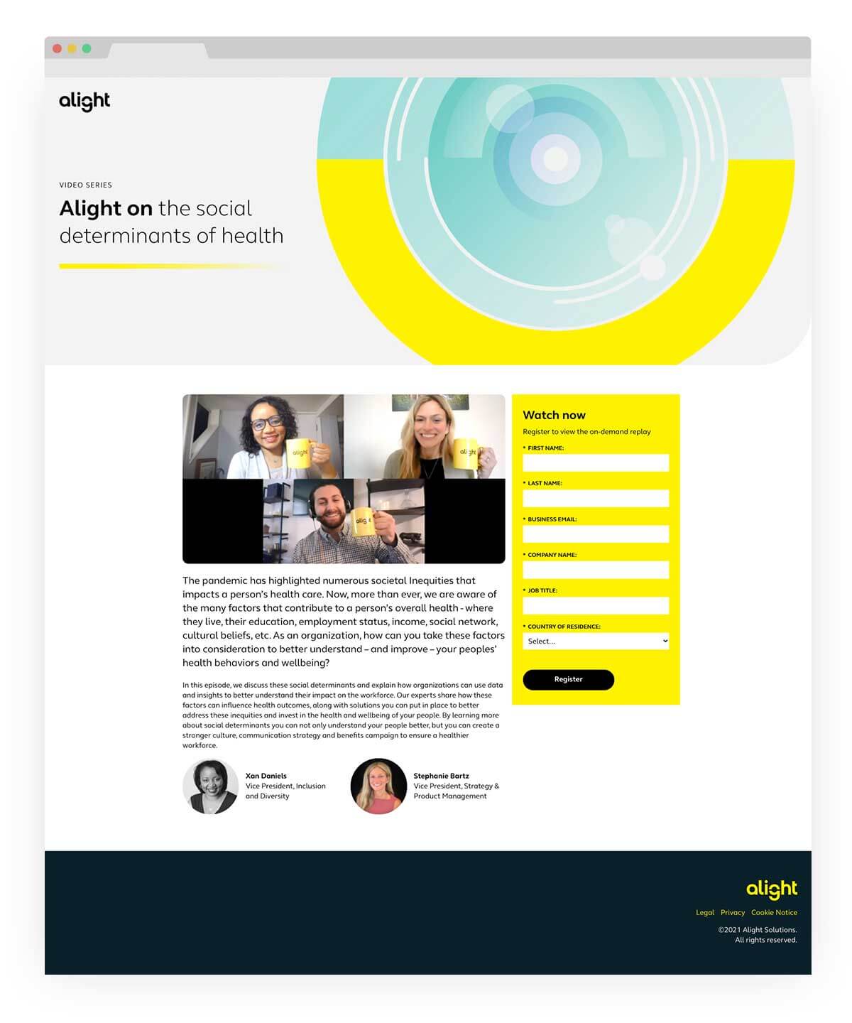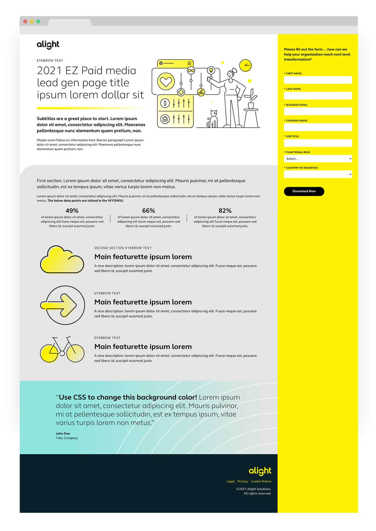 I supported Alight's entrance into the global market — this included an HTML5 and CSS overhaul, creation of standardized email and landing page Marketo templates, and new considerations for web accessibility and support for global languages. This included review of vendor's work, custom Bootstrap SCSS files and cross-training Alight's global marketers. While these templates fulfill a lot of needs, I still create custom paid media landing pages for campaigns when needed.
