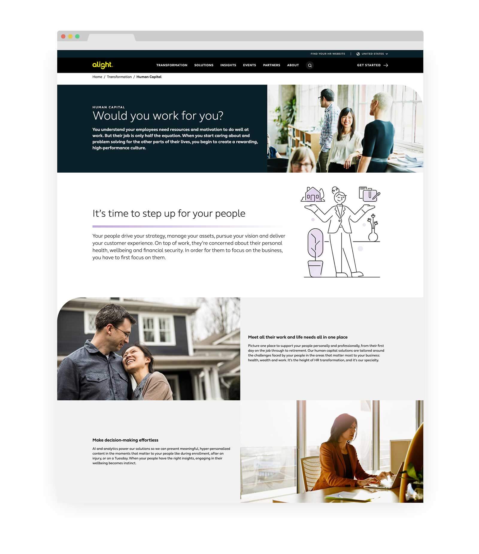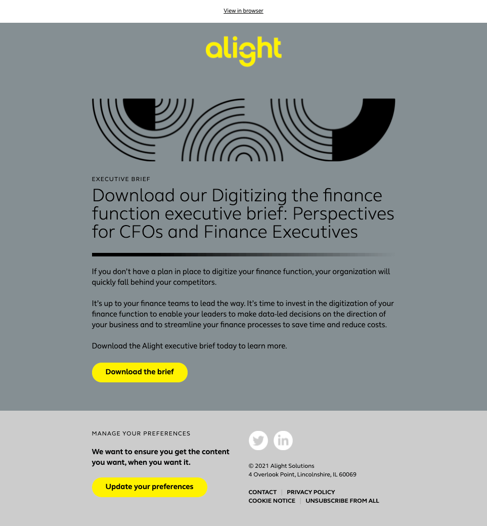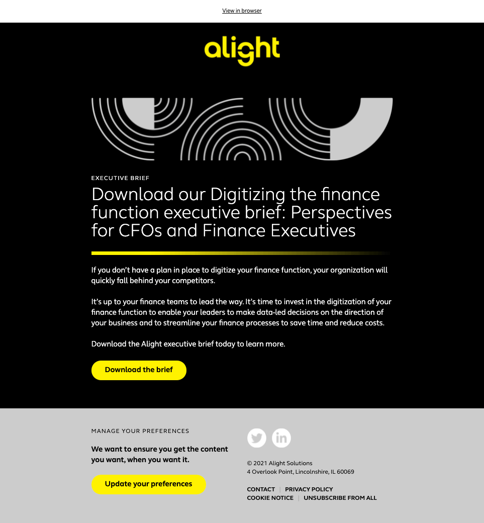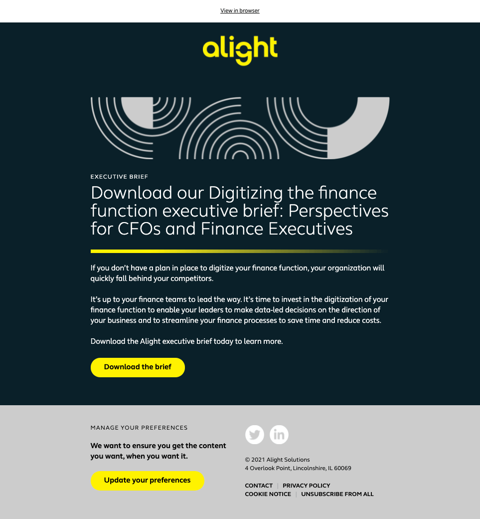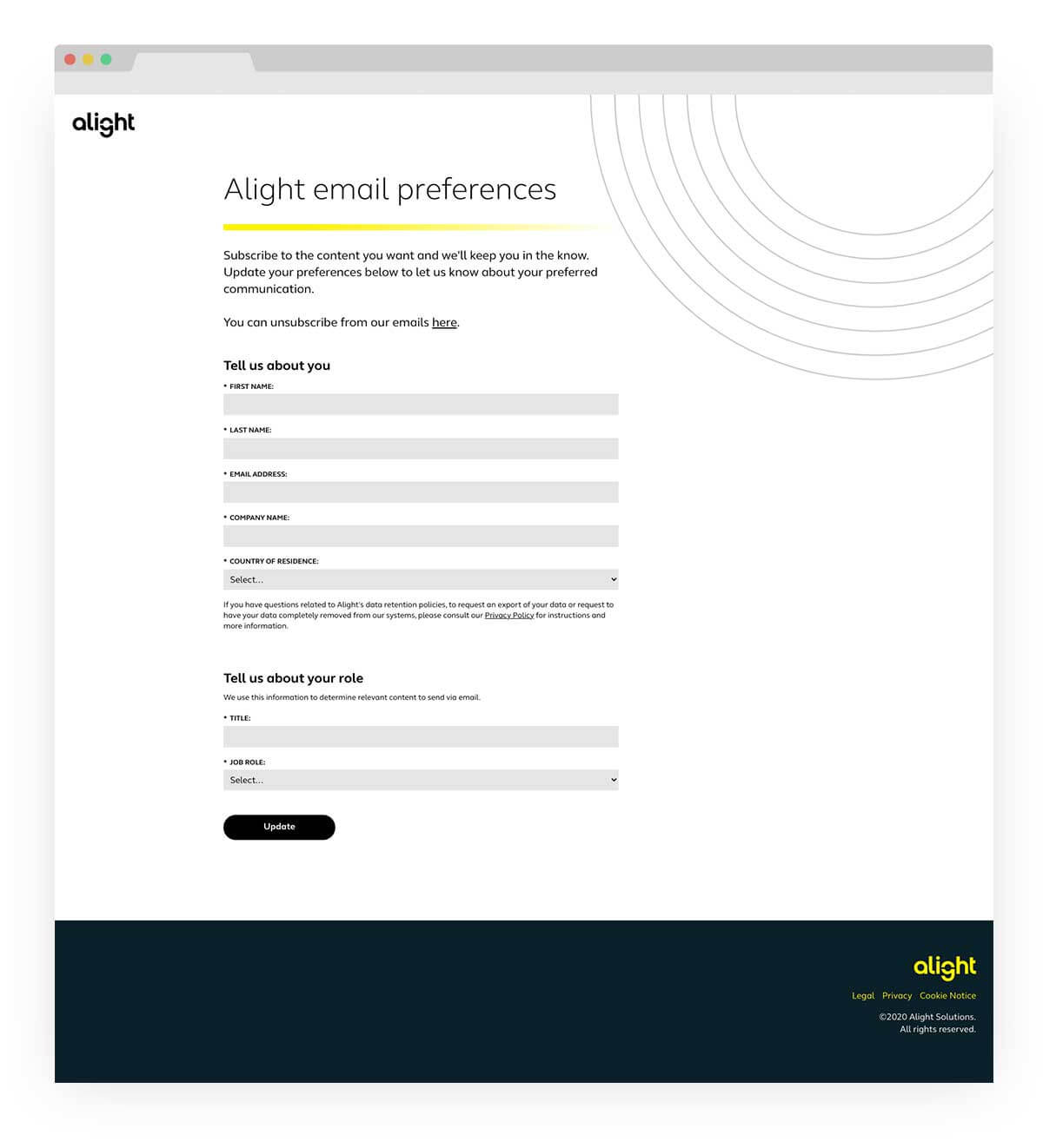 I supported Alight's entrance into the global market — this included an HTML5 and CSS overhaul, creation of standardized email and landing page Marketo templates, and new considerations for web accessibility and support for global languages. This included review of vendor's work, custom Bootstrap SCSS files and cross-training Alight's global marketers. While these templates fulfill a lot of needs, I still create custom paid media landing pages for campaigns when needed.