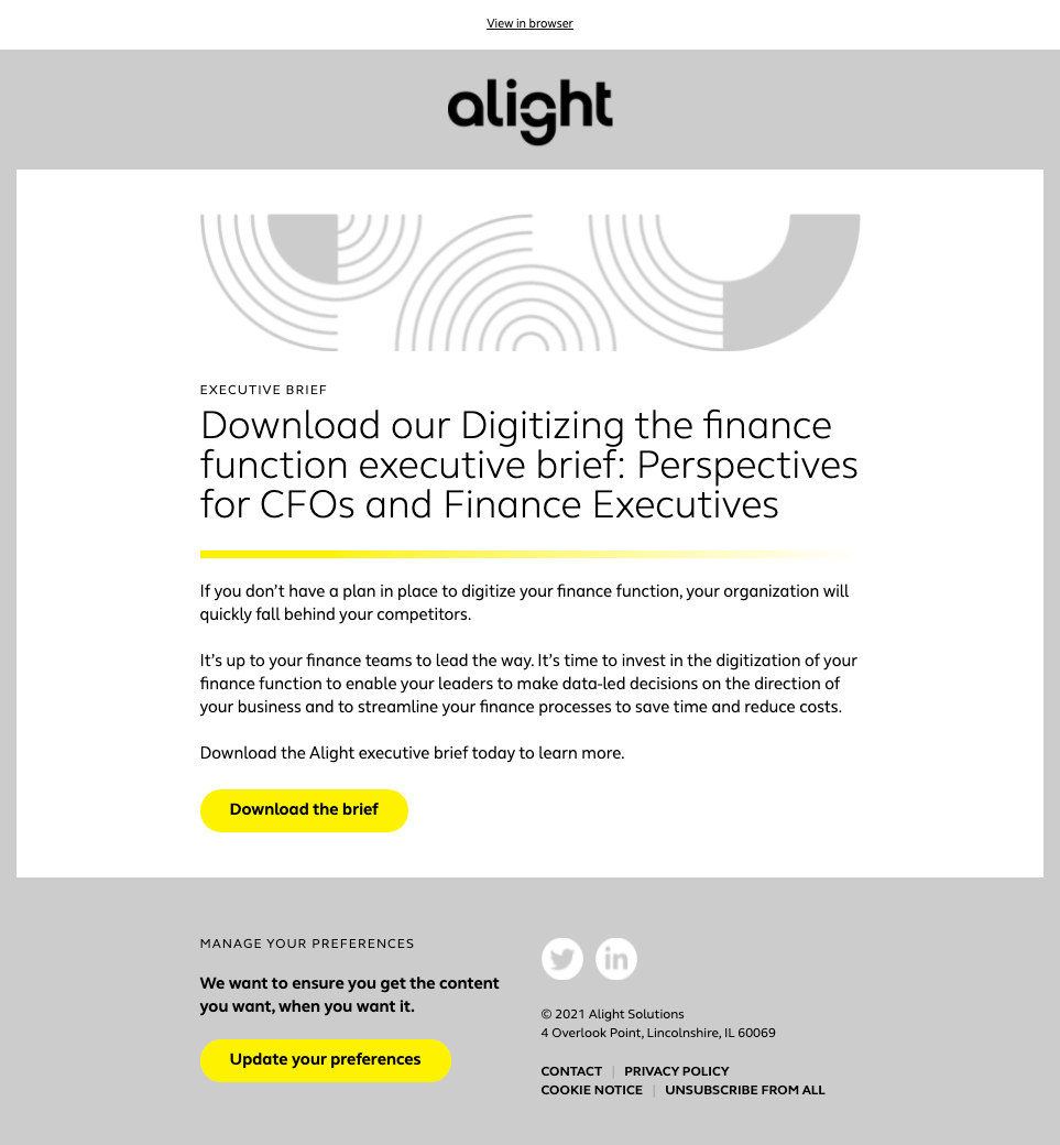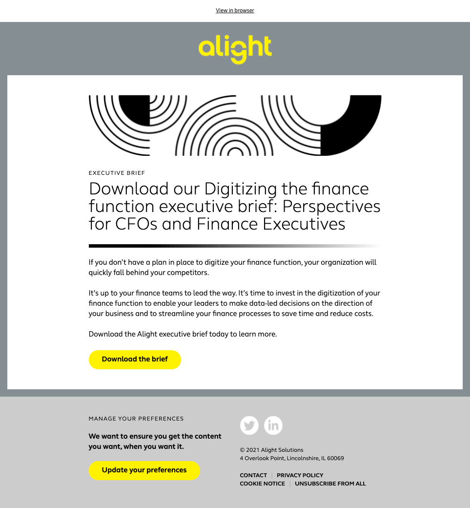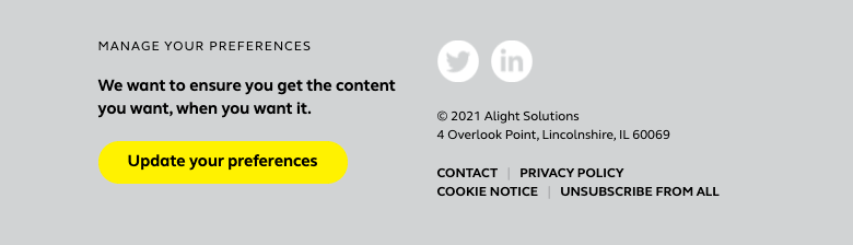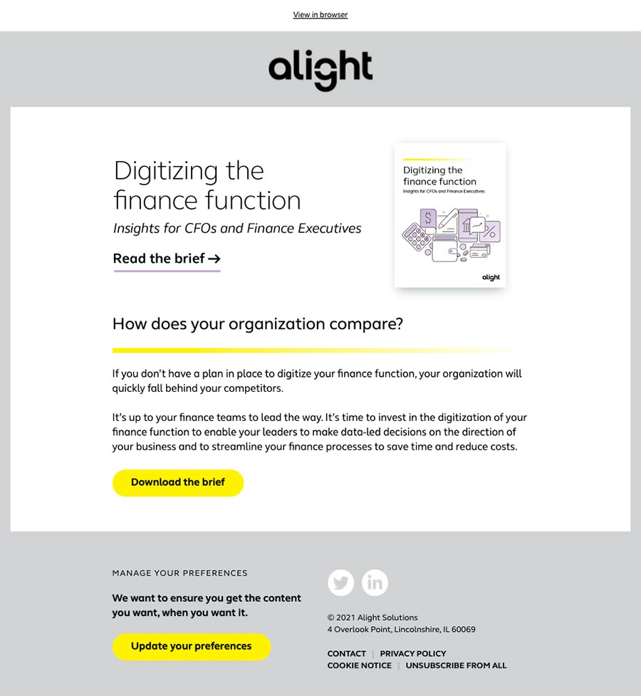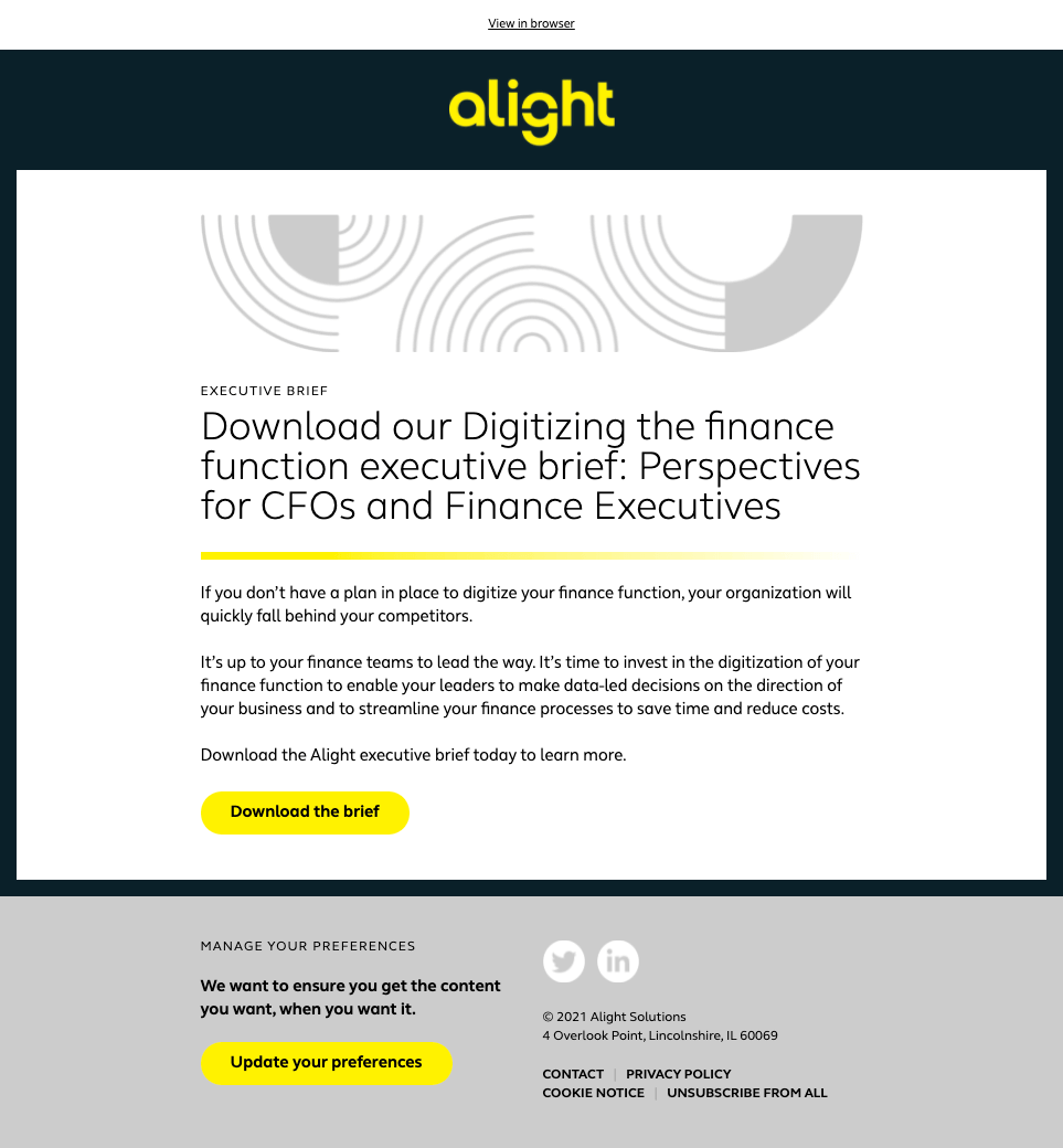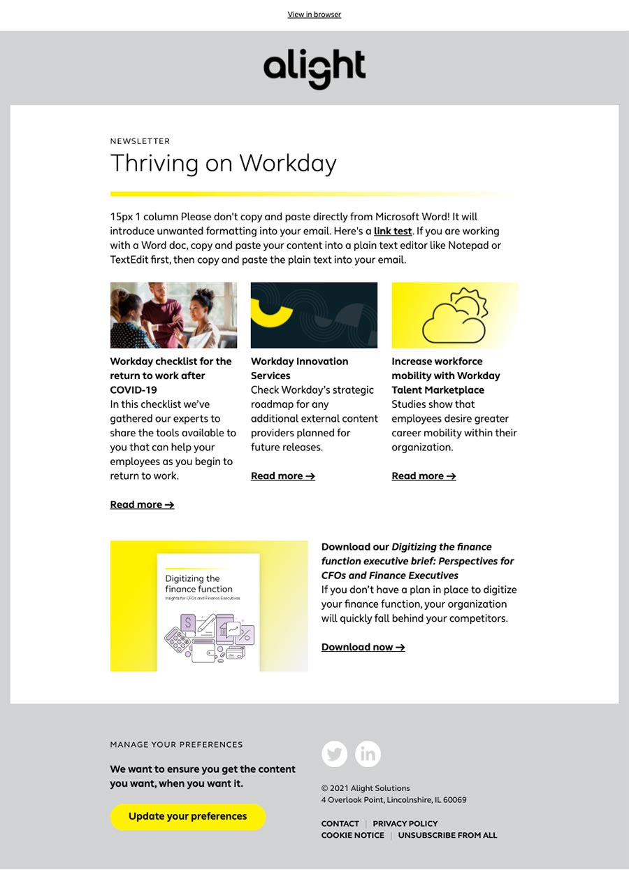 I supported Alight's entrance into the global market — this included an HTML5 and CSS overhaul, creation of standardized email and landing page Marketo templates, and new considerations for web accessibility and support for global languages. This included review of vendor's work, custom Bootstrap SCSS files and cross-training Alight's global marketers. While these templates fulfill a lot of needs, I still create custom paid media landing pages for campaigns when needed.