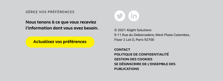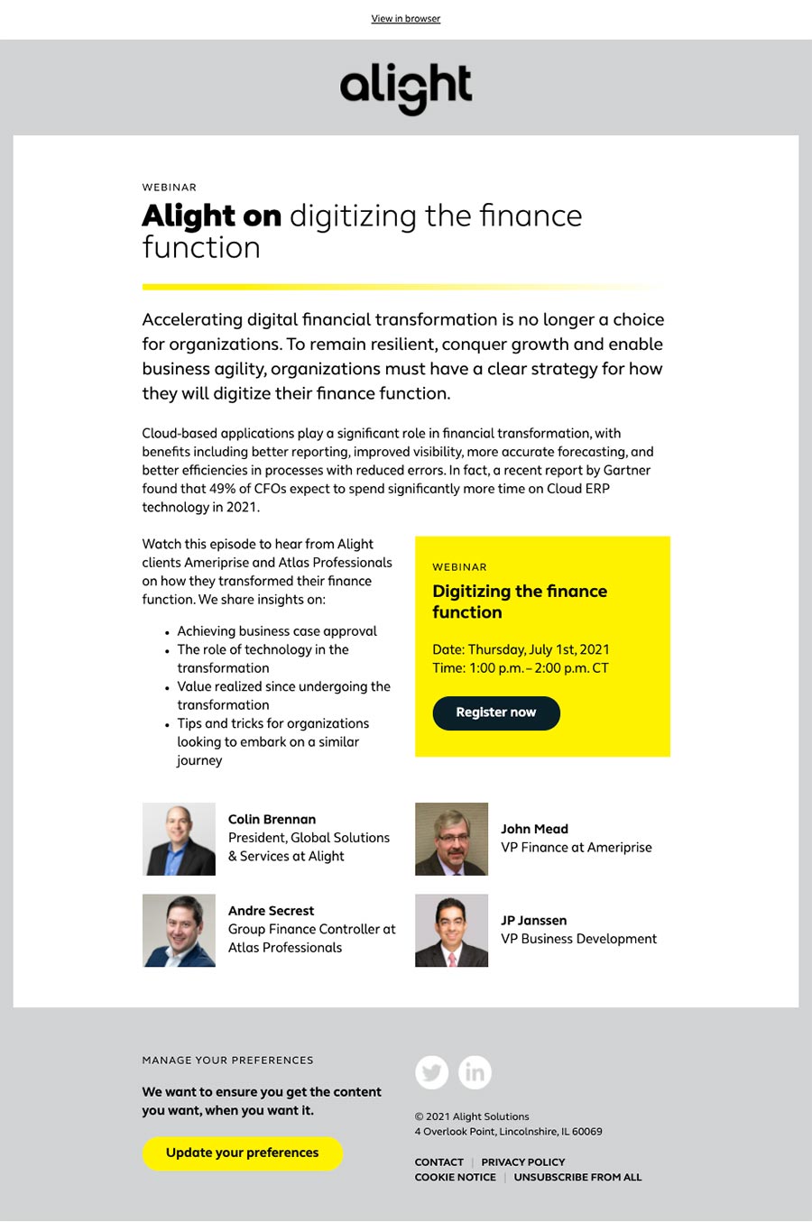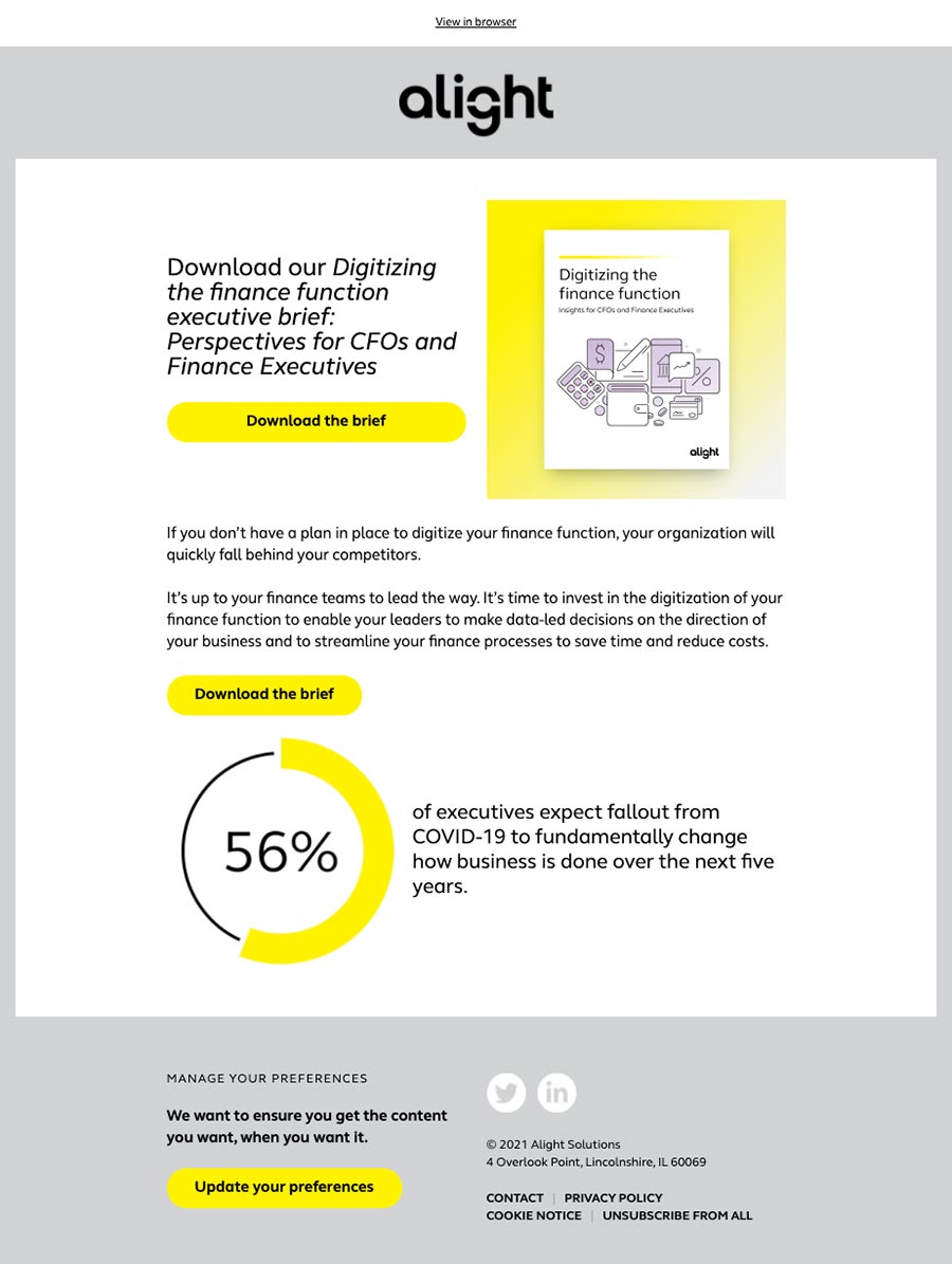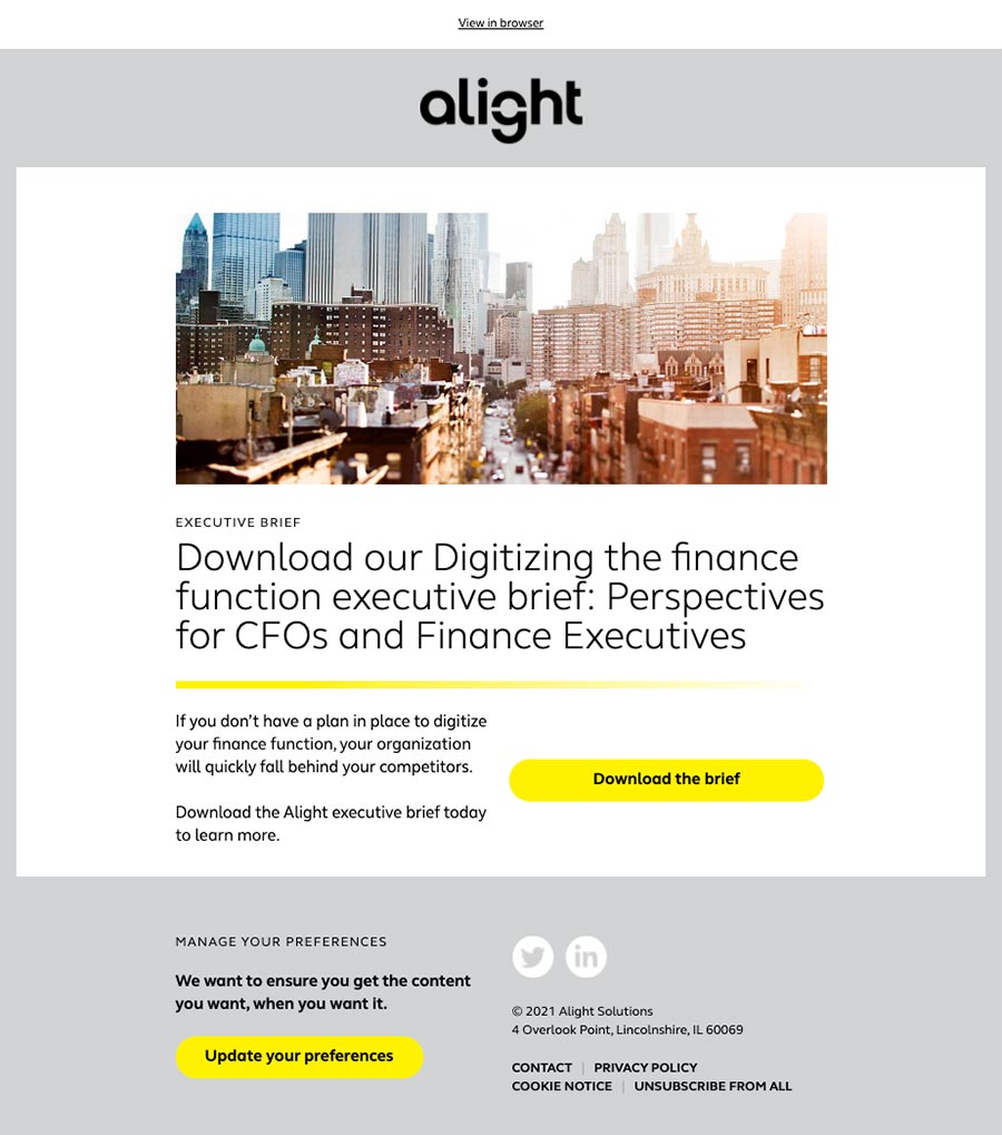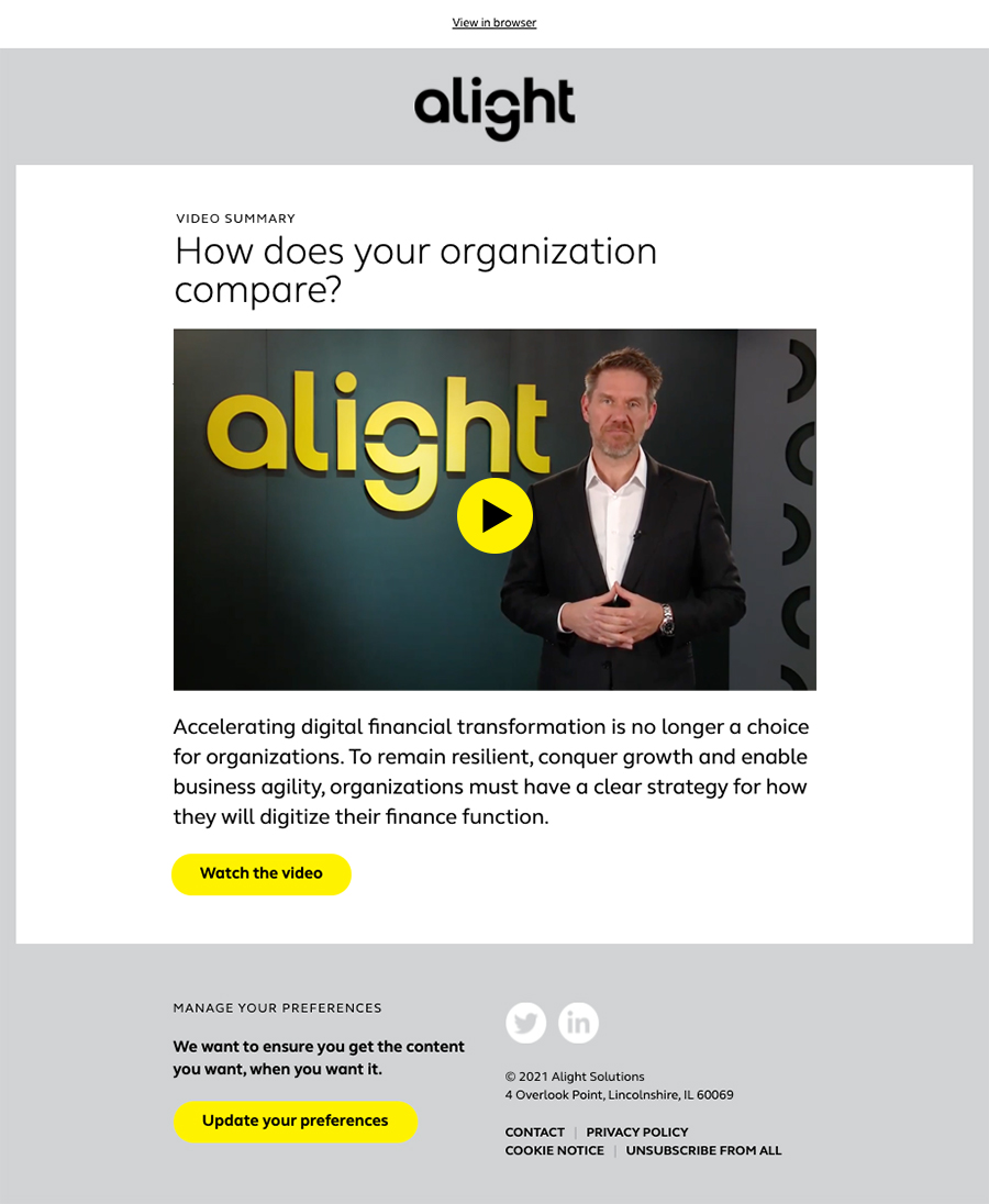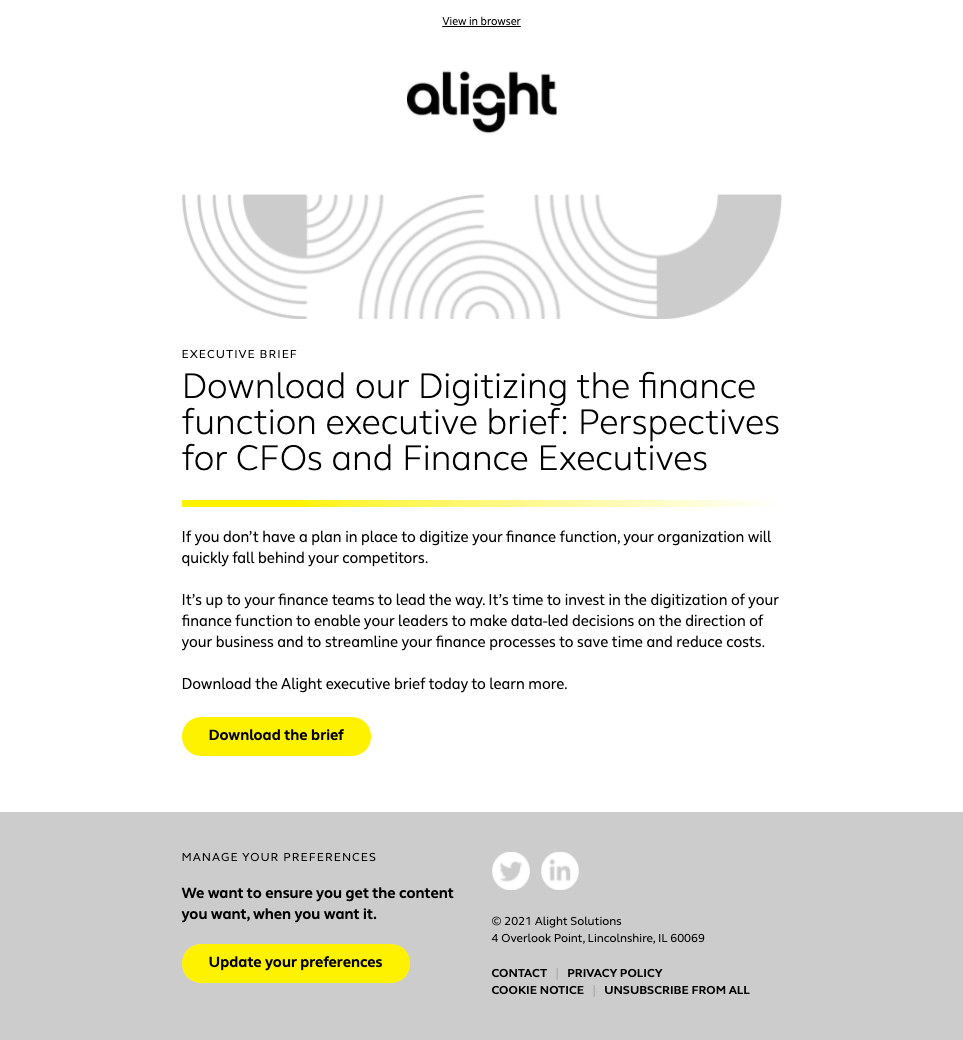 I supported Alight's entrance into the global market — this included an HTML5 and CSS overhaul, creation of standardized email and landing page Marketo templates, and new considerations for web accessibility and support for global languages. This included review of vendor's work, custom Bootstrap SCSS files and cross-training Alight's global marketers. While these templates fulfill a lot of needs, I still create custom paid media landing pages for campaigns when needed.