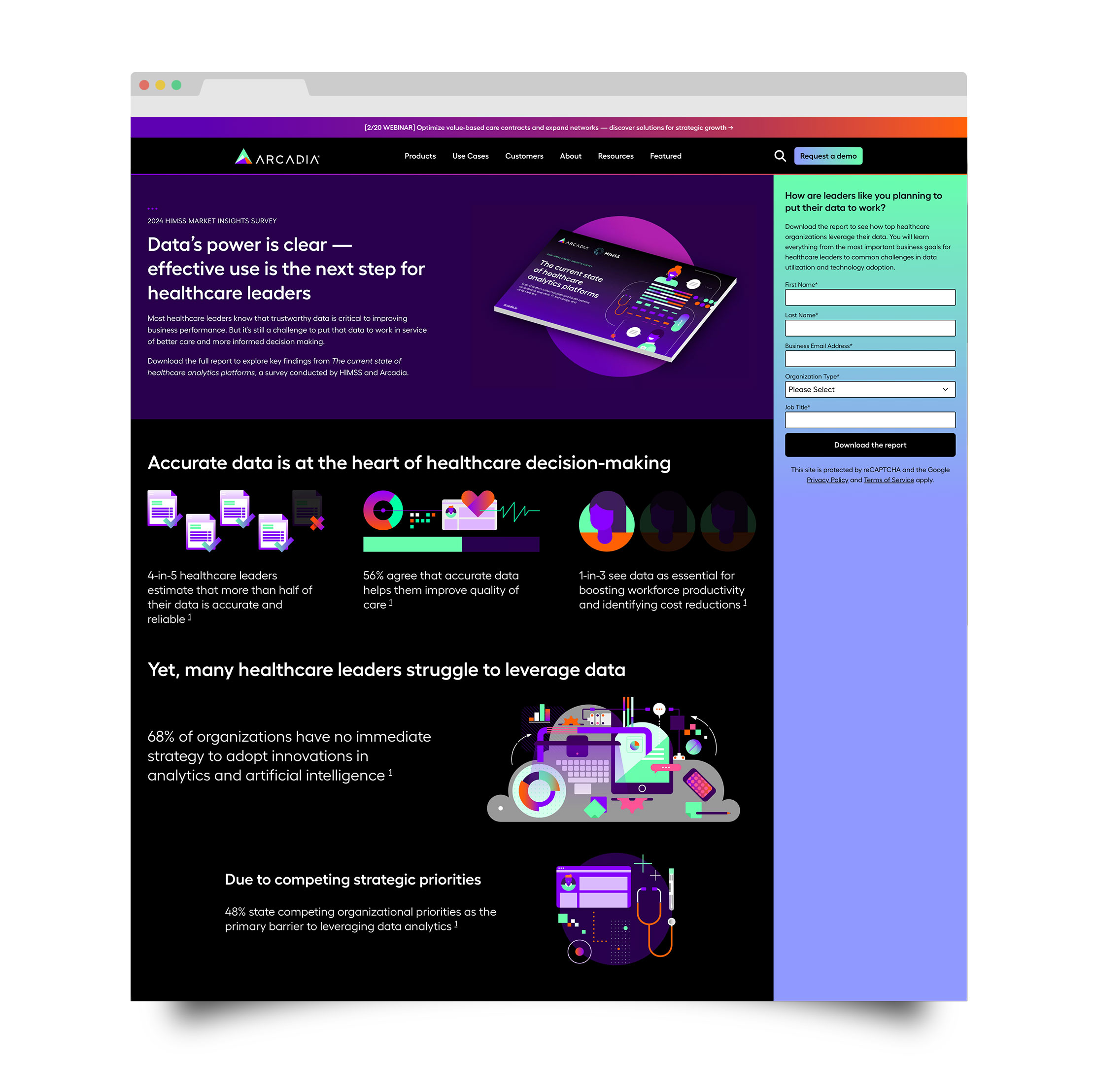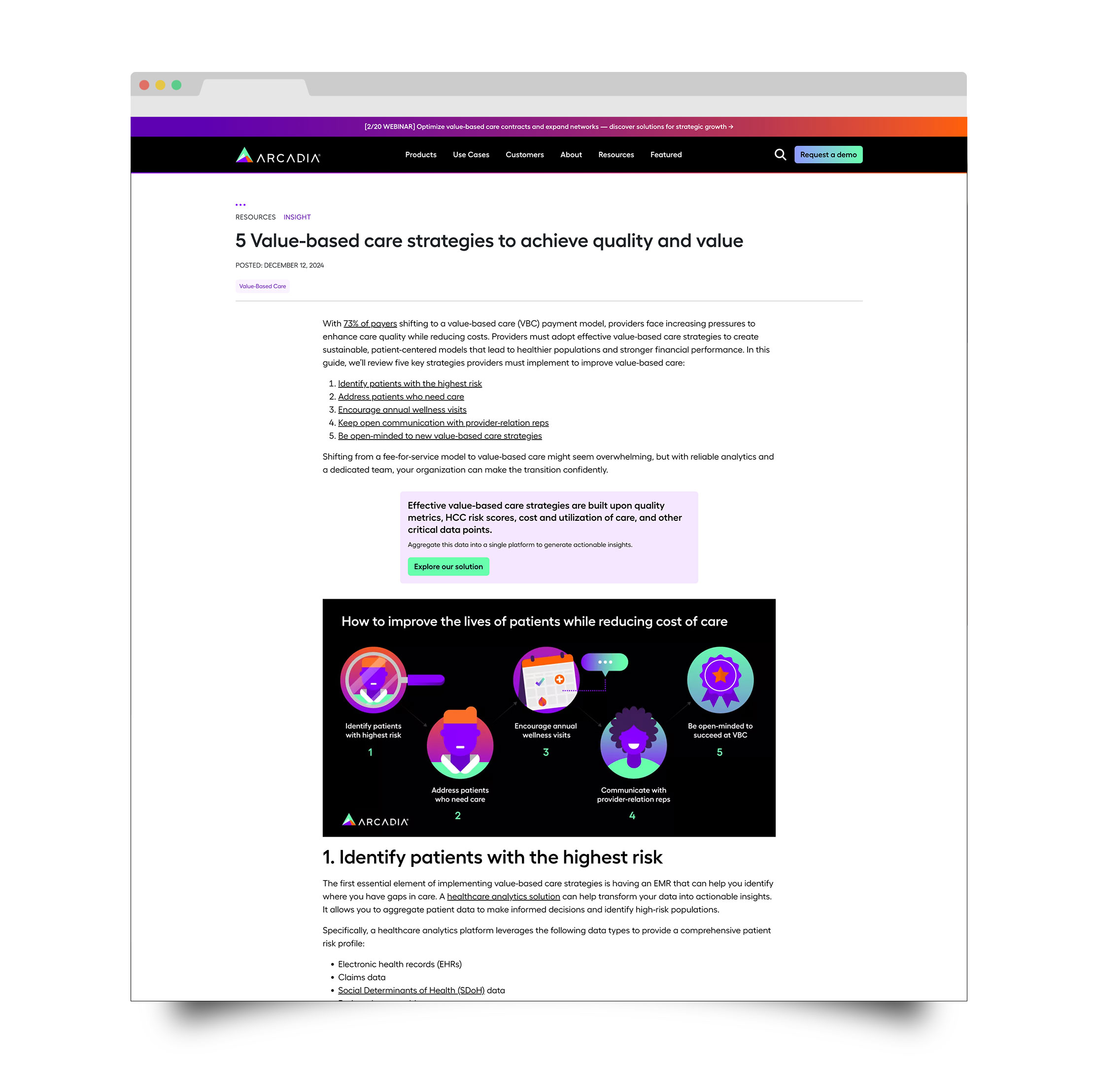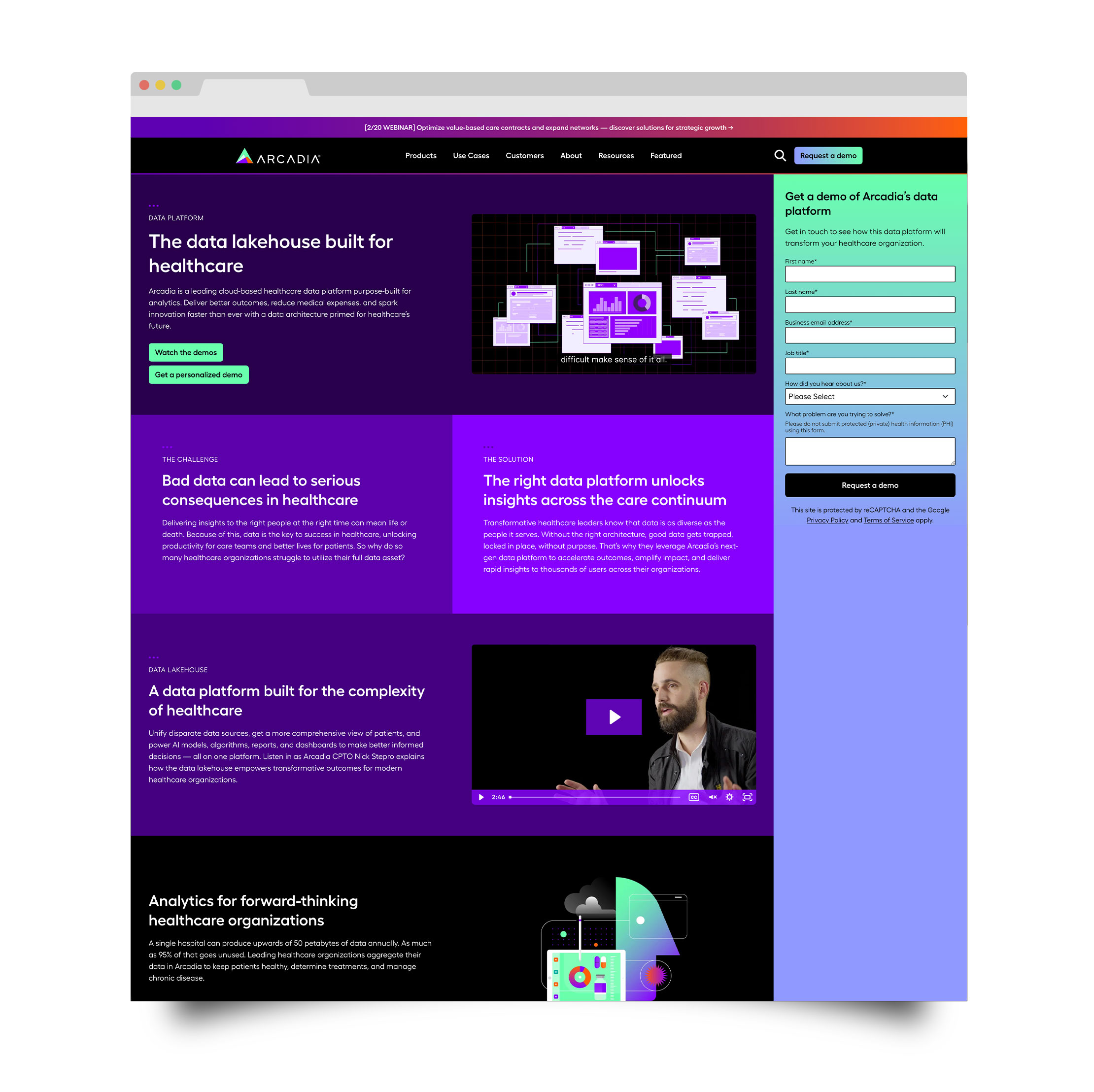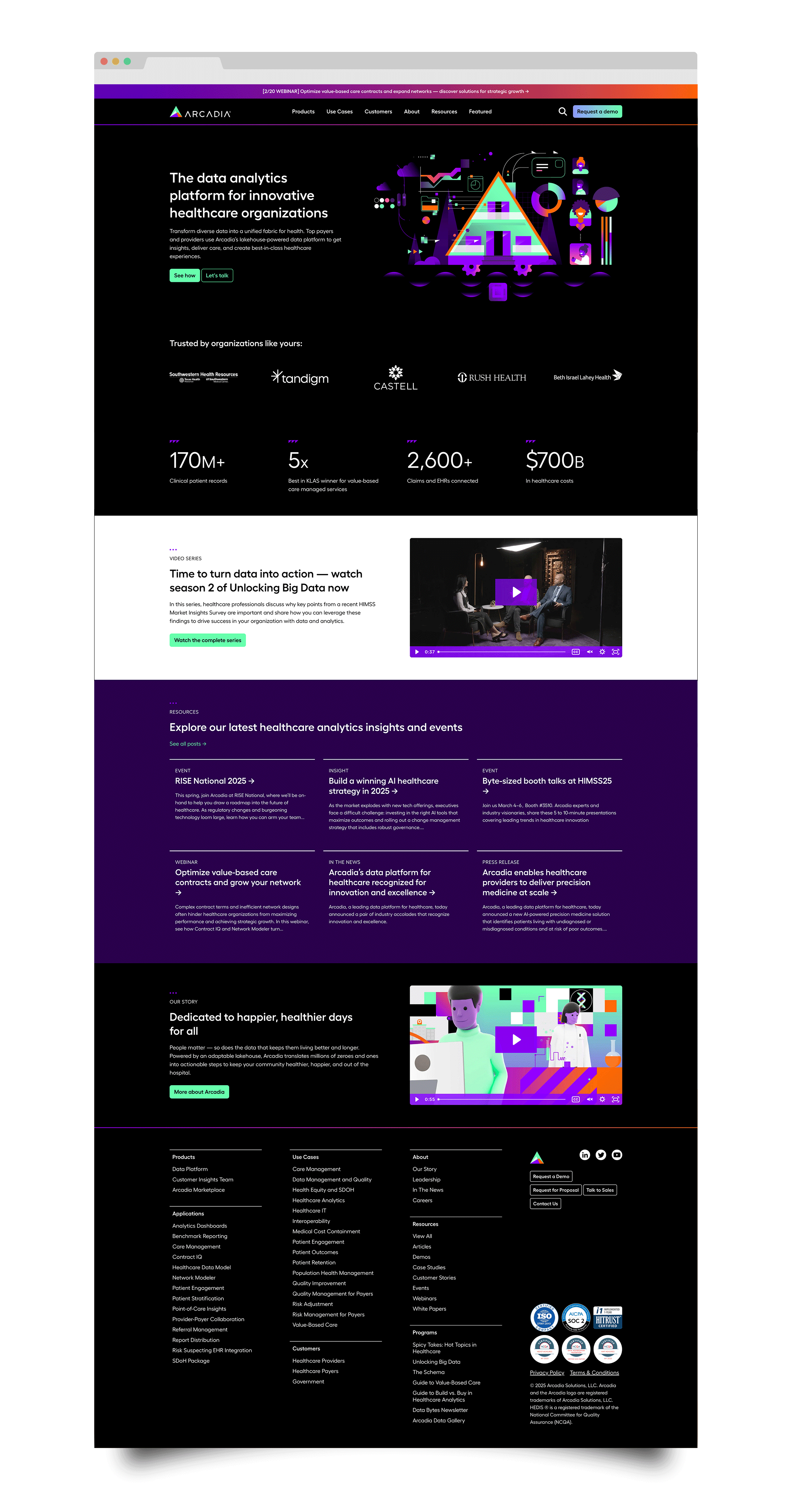 In 2021, Arcadia’s website was limited in scope, with much of its content buried in PDFs and messaging centered around abstract healthcare informatics. As part of the rebrand initiative, I led the site’s data architecture and redevelopment to better showcase Arcadia’s diverse use cases while optimizing for mobile, SEO, and performance.
